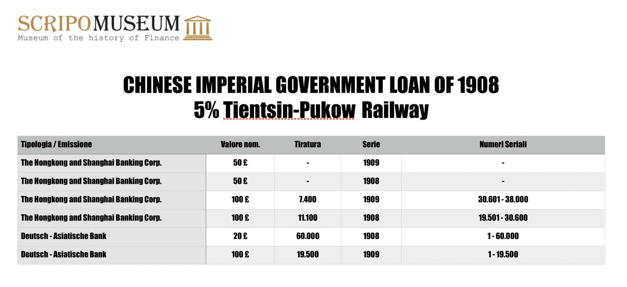 Il prestito ferroviario Tientsin-Pukow del 1908 era per la somma di capitale di £ 5.000.000. Il prestito fu “… autorizzato dall’editto imperiale del 13 gennaio 1908, comunicato ufficialmente dal Wai Wu Pu1 ai ministri della Gran Bretagna e della Germania a Pechino. Garantito in termini di capitale e interessi dall’obbligo diretto del governo imperiale cinese e garantito da una prima accusa su determinate entrate provinciali delle province di Chili, Shantung e Kiangsu. ”