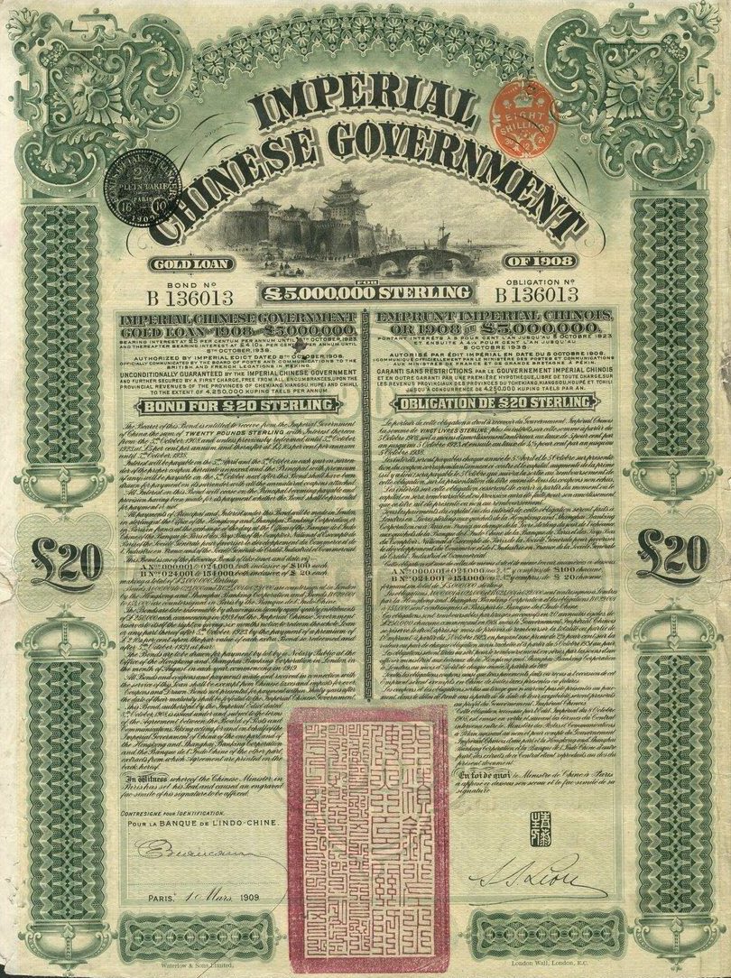 1908 – China 5% Gold Loan – Issued by Banque de l’Indo-chine
