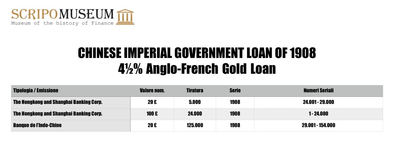 Il prestito d’oro anglo-francese del 1908 era per la somma di capitale di £ 5.000.000. Il prestito fu “… autorizzato dall’editto imperiale dell’8 ottobre 1908, comunicato ufficialmente dal Board of Posts and Communications alle Legazioni britanniche e francesi a Pechino. Garantito incondizionatamente dal governo imperiale cinese e ulteriormente assicurato con una prima accusa, libera da tutti gli ingombri, sulle entrate provinciali delle province di Chekiang, Kiangsu, Hupei e Chihli nella misura di 4.250.000 taupi Kuping all’anno. ”
