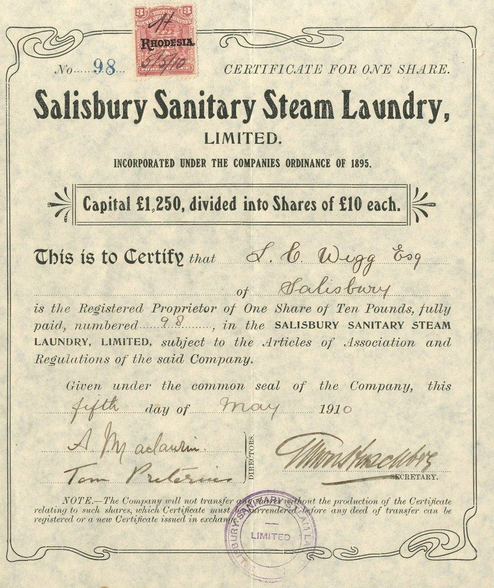 1910 – Salisbury sanitary steam laundry limited – £10 Shares