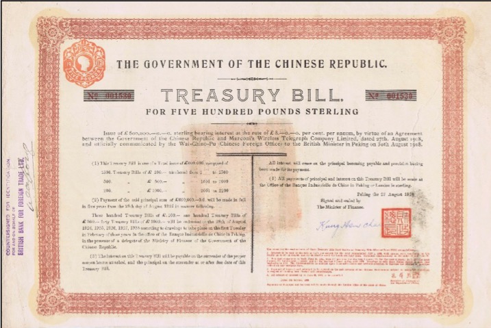 Il prestito telegrafico senza fili Marconi del 1918 era per la somma di capitale di £ 600.000. Il prestito è stato organizzato; "... in virtù di un accordo tra il governo della Repubblica cinese e la Wireless Telegraph Company Limited di Marconi, datato 27 agosto 1918 e comunicato ufficialmente dal Wai Chiao Pu1 al ministro britannico a Pechino il 30 agosto 1918."