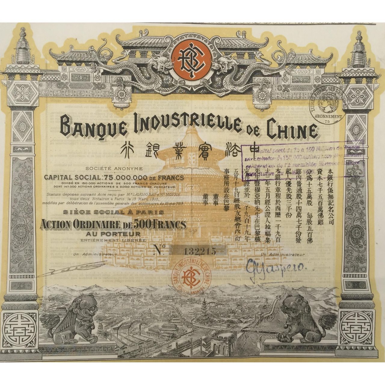1919 Bank Industrial of China – Capital 75.000.000 Francs