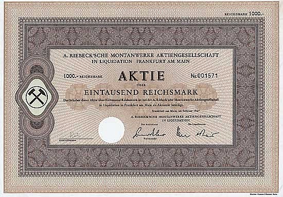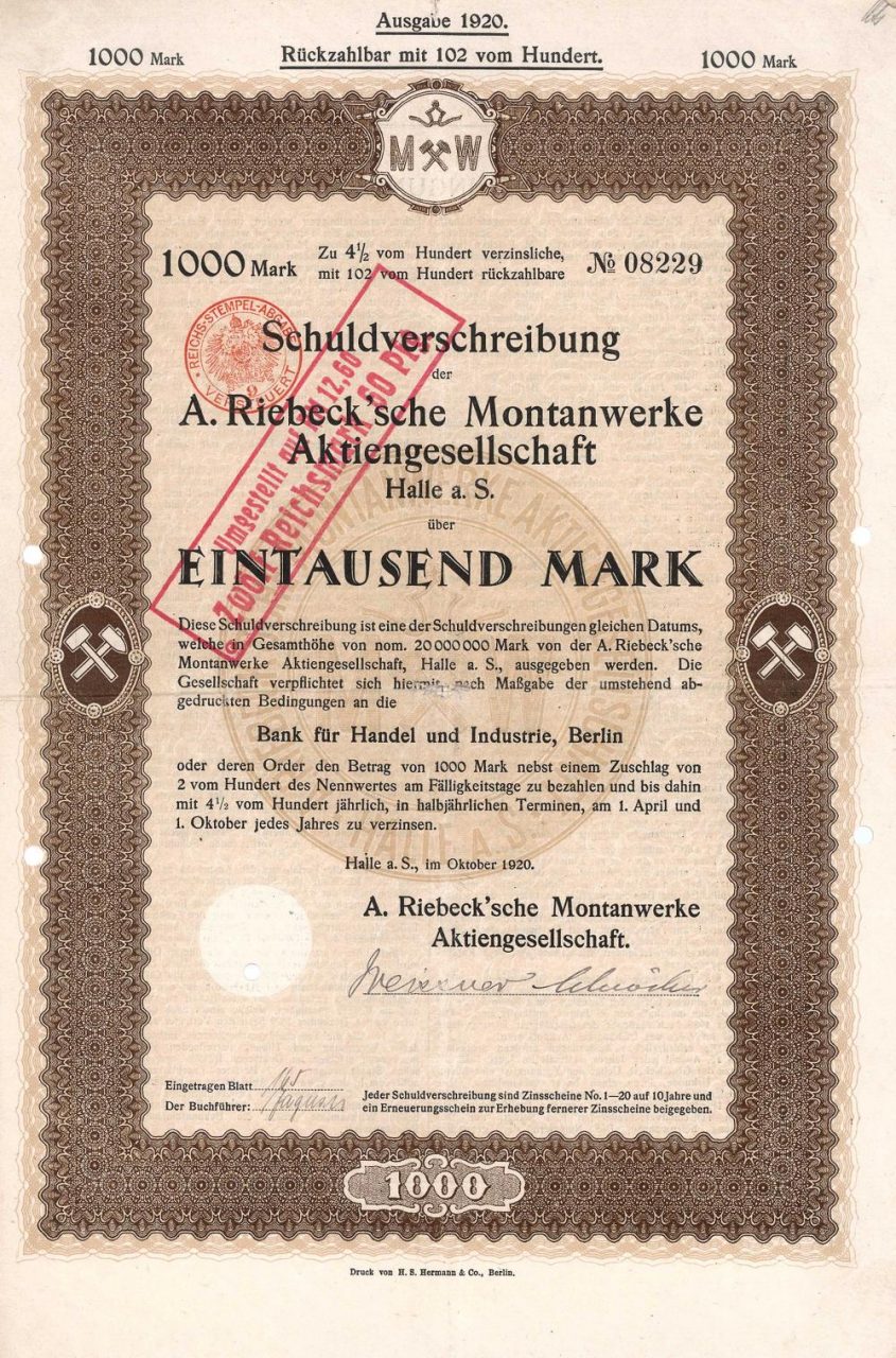 La società, fondata da Kommerzienrat Riebeck, divenne una AG nel corso della disputa tra i suoi eredi nel 1883, e nel 1888 un consorzio bancario rilevò tutte le azioni. La società è stata fondata su dozzine di miniere di lignite (in parte ingegneria civile, in parte miniere a cielo aperto) a Oberröblinger, Zeitz-Weissenfelser e nel distretto di Halle. Un’altra importante attività era la lavorazione del catrame ottenuto dalla combustione di oli minerali e paraffina. Numerose compagnie minerarie vicine sono state acquisite nel corso degli anni. Nel 1923 ulteriore espansione delle proprietà minerarie con l’acquisizione del sindacato Messel vicino a Darmstadt (esternalizzato nel 1954 come “Paraffin and Mineral Oil Works Messel”, venduto alla società svedese Ytong AB nel 1959; l’ex miniera di lignite Messel è ora un sito del patrimonio mondiale come eccezionale sito fossile). Sempre nel 1923, gli interessi degli oli minerali essenziali furono rilevati dalla sfera di influenza di Stinnes, in questo contesto la società fu brevemente ribattezzata “Hugo Stinnes-Riebeck Montan- und Oelwerke AG”. Nel 1926 conclusione di un contratto di interesse con I.G. Farbenindustrie AG, secondo la quale ciascun azionista 2: 1 in I.G. Farben è stato in grado di scambiare azioni (a proposito, questa clausola è stata oggetto di processi molto noti tra le due società fino alla fine degli anni ’80). Nel 1931 la Rheinische Stahlwerke rilevò un ampio pacchetto di azioni Riebeck da I.G. Farben e divenne quindi l’azionista di maggioranza con l’87%. Espropriata a favore dello stato della Sassonia-Anhalt nel 1945. Dopo la guerra, le azioni Riebeck furono nuovamente detenute da I.G. Farben (circa il 50%) e Rheinstahl (circa il 40%). Nel 1966 trasferimento da Halle (Saale) a Francoforte (Main).