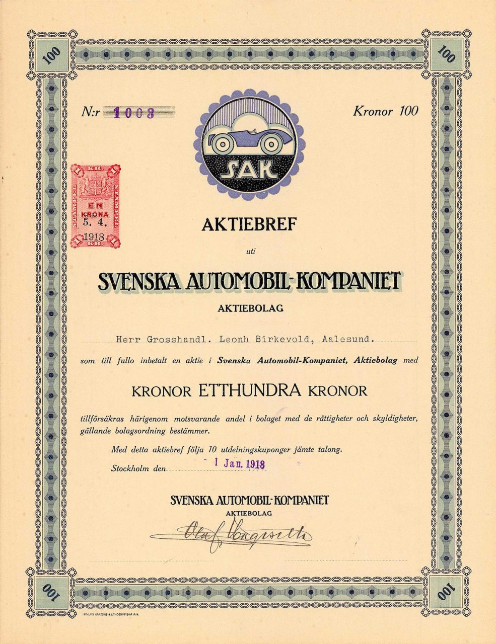 B-61629AB Svenska Automobilfabriken-2Stoccolma19181 azione nominativa da 100 CoroneR3 (501-1000 pezzi)S3 (da 51 a 100 €)