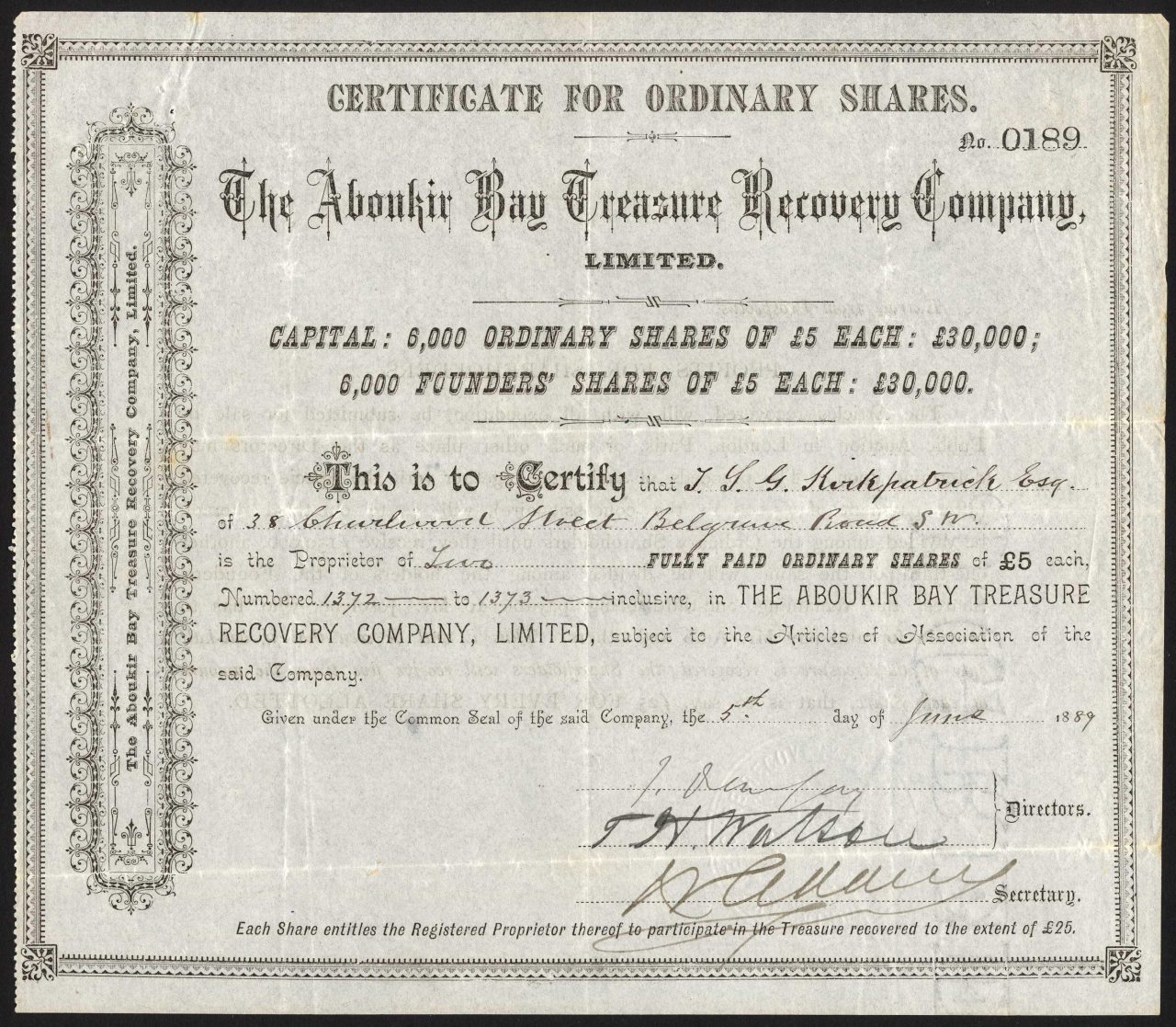 Registrato nel 1889. Ottenne una concessione governativa per la ricerca di navi della flotta napoleonica affondate durante la Battaglia del Nilo nel 1798. Il presidente del consiglio di amministrazione era l’ammiraglio Sir Henry Keppel. Da quel momento ci sono state molte spedizioni per trovare le navi perdute, ma sono state localizzate solo nel 1998 da ricercatori subacquei. Dissolto <1916. Numero di società 28917