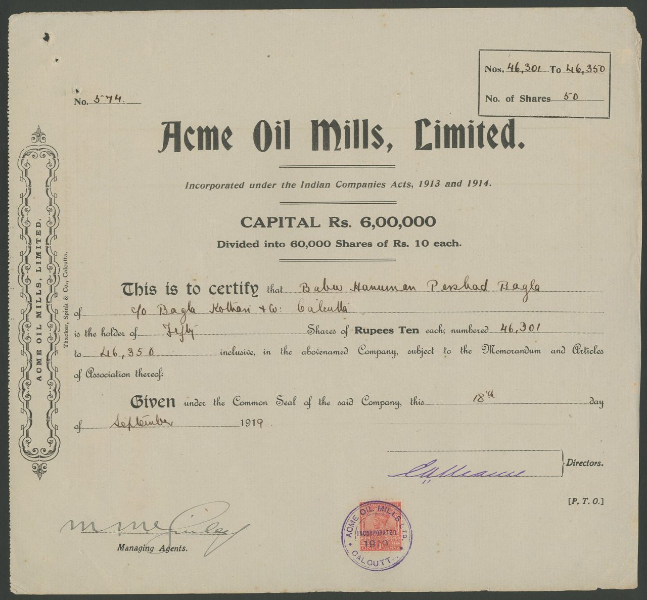 Incorporato ai sensi dell’Indian Companies Act 1913 e 1914. Capitale 6.000.000 di rupie in 60.000 azioni di 10 rupie.