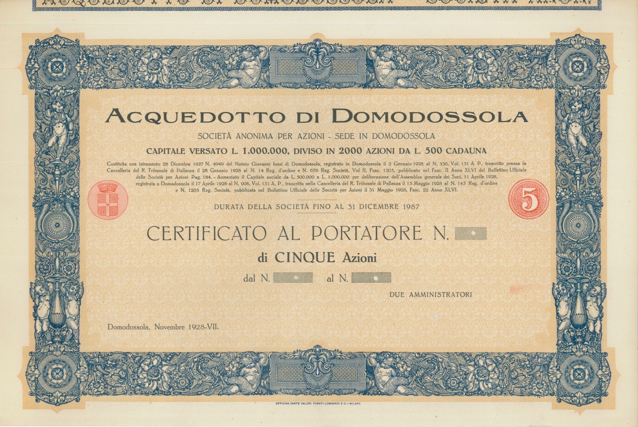 A-9370Acquedotto di Domodossola-1Officina Carte Valori Turati Lombardi e C. - MilanoVerbano-Cusio-Ossola19285 azioniR4 (251-500 pezzi)S4 (da 101 a 250 €)