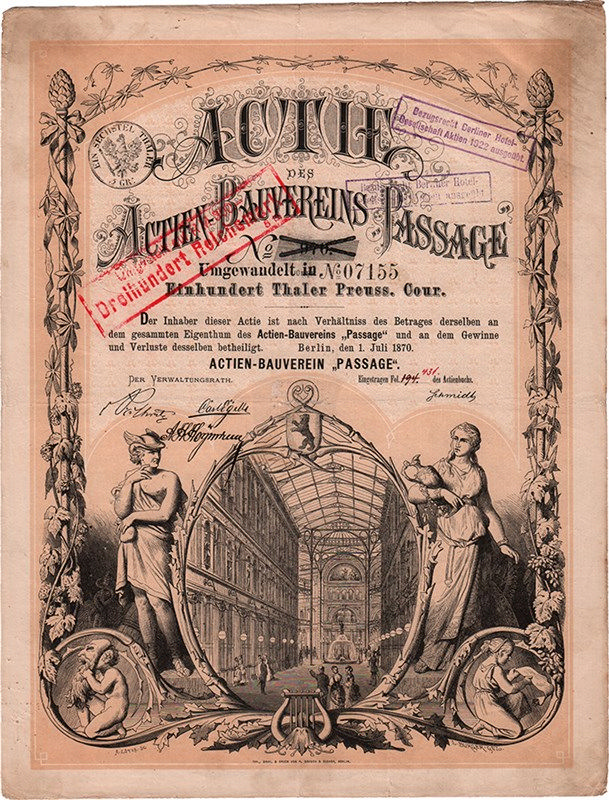 La società fu fondata nel 1870 per l’acquisto di terreni e fabbricati a Berlino, all’epoca in Prussia. Costruì ed esercitò, inoltre, la Kaiser Galerie o Galleria dell’Imperatore, un passaggio lungo 130 metri per congiungere il maestoso Boulevard Unter den Linden (Viale dei Tigli) con la Friedrichstrasse. L’elegante centro commerciale, progettato dagli architetti Walter Kylmann (1837-1913) e Adolf Heyden (1838-1902), accoglieva una sala per concerti, un hotel, un cabaret, un museo di statue di cera, vari ristoranti e negozi di lusso. Tale tempio del divertimento fu però completamente distrutto nel 1944, durante la seconda guerra mondiale. Magnifico fronte, a firma A. Lűtke e L. Burger, riproducente uno scorcio della splendida galleria berlinese affiancato dalle divinità del Commercio e dell’Industria, con altri personaggi ispirati al concetto di attività artistiche.