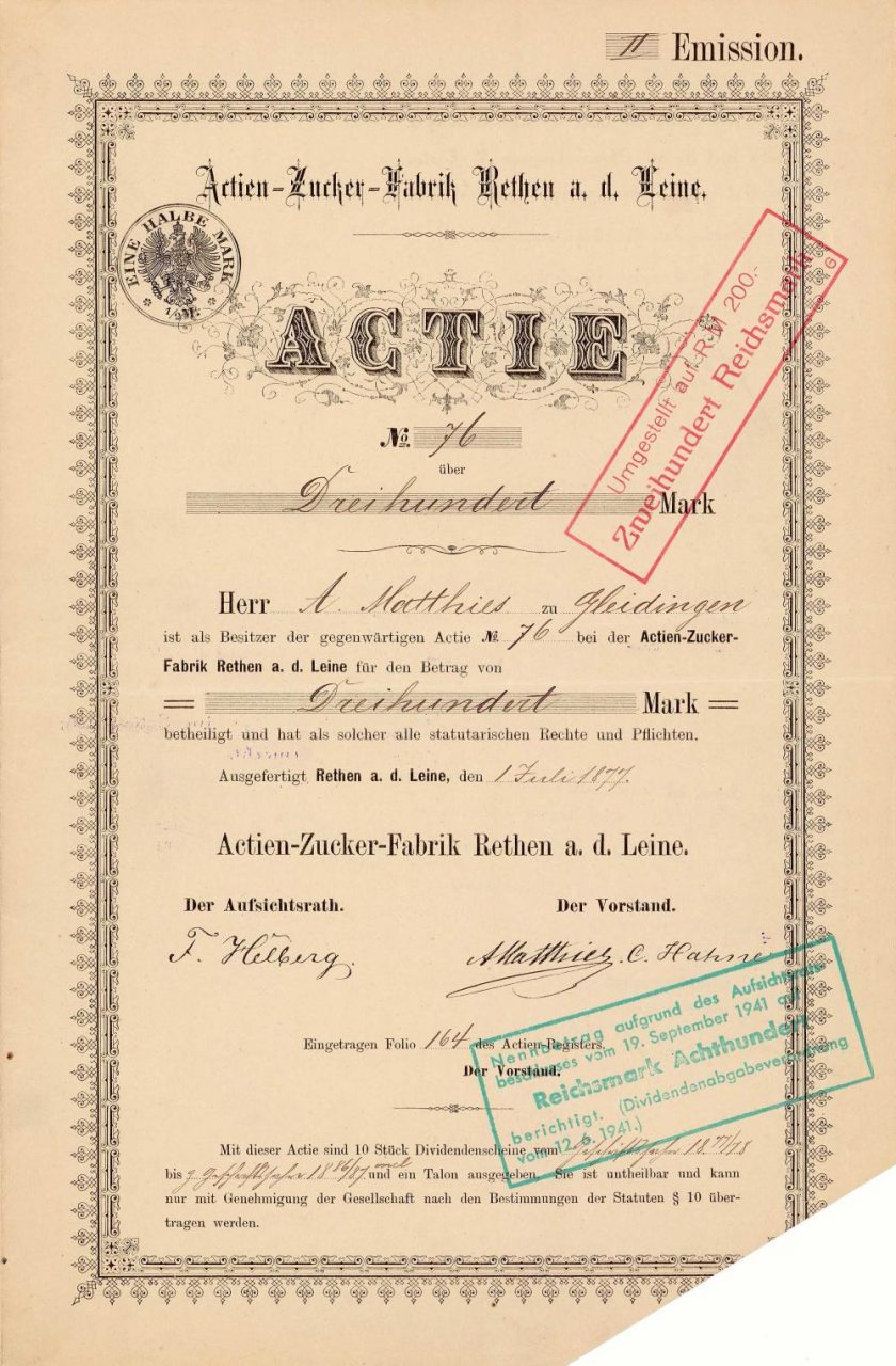 A-65655Actien-Zucker-Fabrik Rethen a.d. Leine-1Rethen18771 azione nominativa da 300 MarchiR3 (501-1000 pezzi)S4 (da 101 a 250 €)