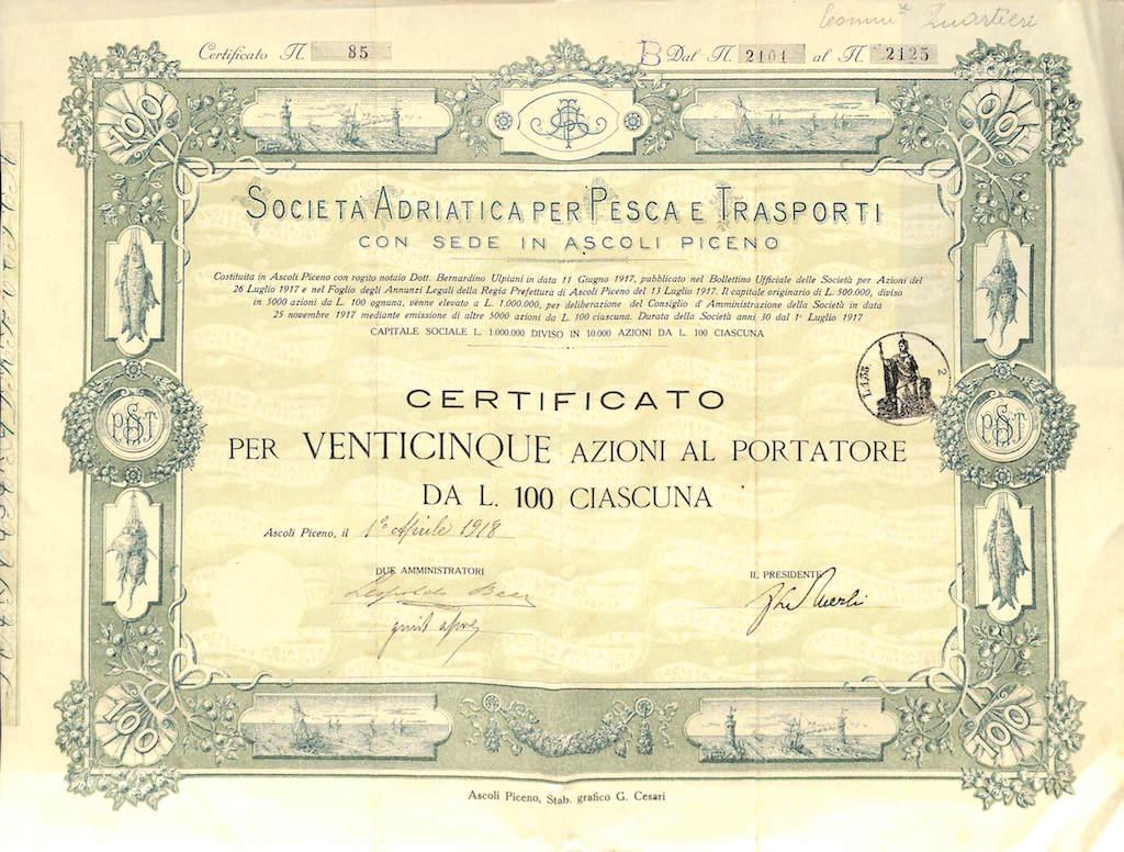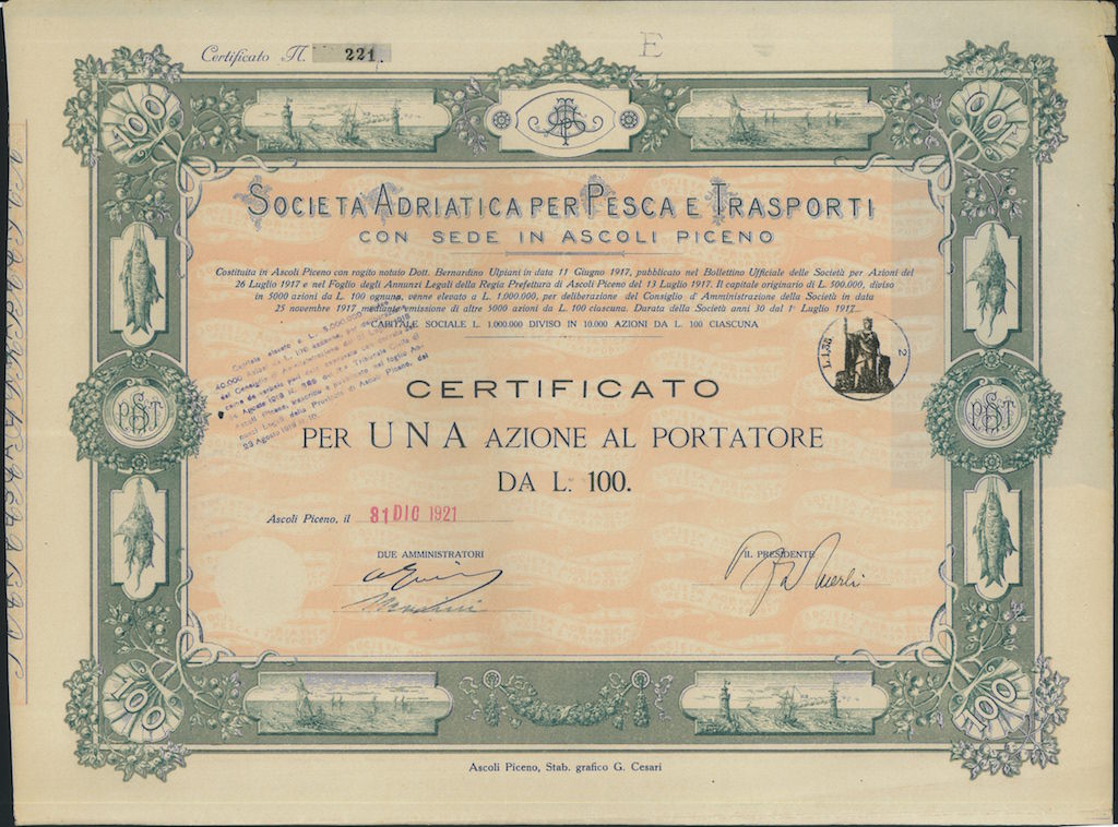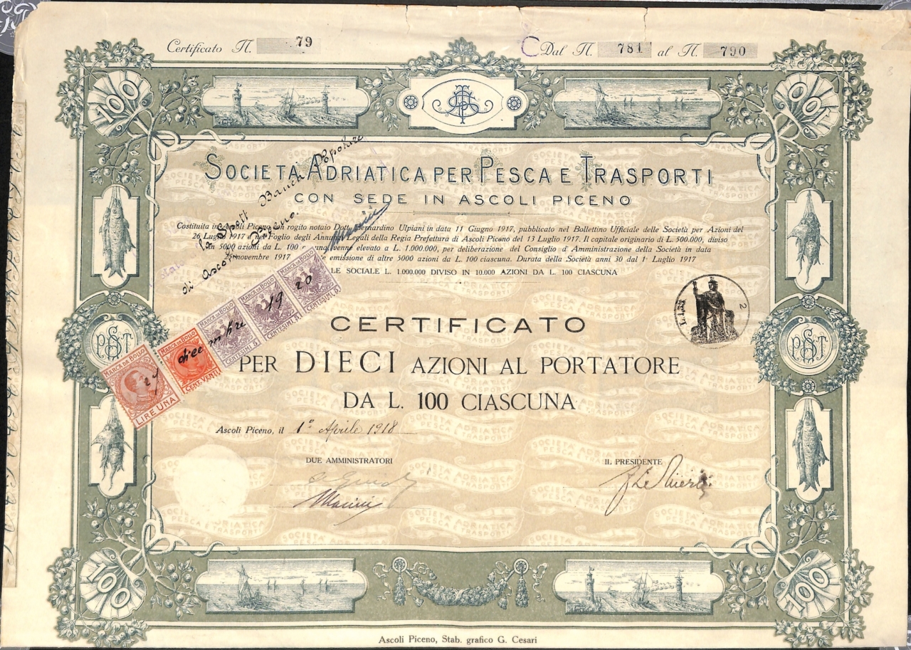 La regione Marche rivestì da sempre un ruolo primario in Adriatico per la sua lunga storia marinaro - peschereccia. La compagnia nacque nel 1917 con sede legale ad Ascoli Piceno e stabilimenti ad Ancona, Porto San Giorgio, San Benedetto del Tronto. Il suo obbiettivo principale fu l' industria della pesca e le attività accessorie quali la conservazione e la lavorazione del pesce - sia salato che in scatola - l' esercizio dei trasporti marittimi, la gestione degli impianti e degli stabilimenti affini nonché delle fabbriche per la costruzione di apparecchi e materiali necessari... Altro