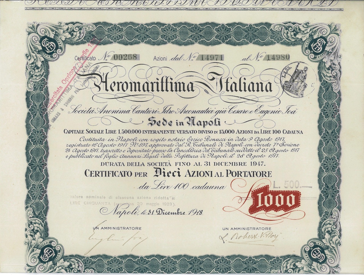B-12911Aeromarittima Italiana-2Officina Carte Valori S.A. Richter & C. NapoliNapoli191810 azioniR3 (501-1000 pezzi)S3 (da 51 a 100 €)