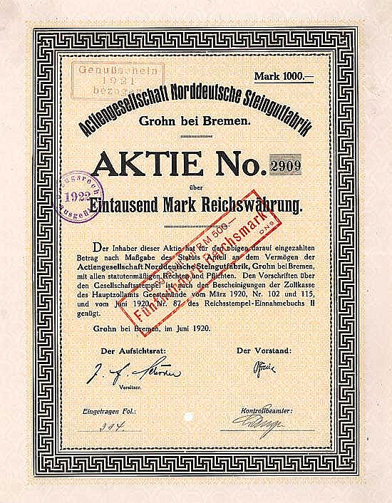 B-65686AG Norddeutsche Steingutfabrik-2Grohn bei Bremen19201 azione da 1.000 Marchi--