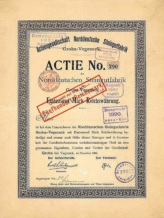 A-65686AG Norddeutsche Steingutfabrik-1Grohn bei Vegesack19051 azione da 1.000 Marchi--