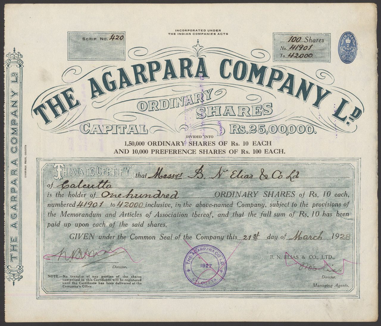 Capitale 25.00.000 rupie in 1.50.000 azioni ordinarie da 10 rupie e 10.000 azioni privilegiate da 100 rupie.