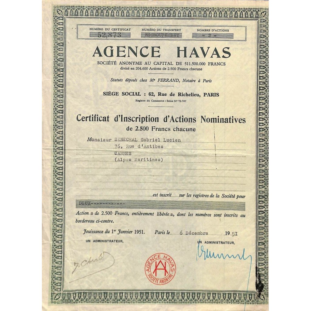 A-52325Agence havas-1 Parigi1951Azioni nominativeR1 (Più di 5000 pezzi)S1 (da 0 a 25 €)