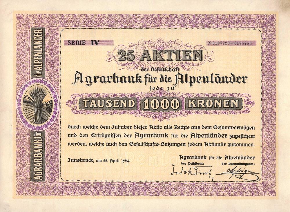A-60452Agrarbank für die Alpenländer-1Innsbruck192425 azioni da 1.000 CoroneR2 (1001-5000 pezzi)S2 (da 26 a 50 €)