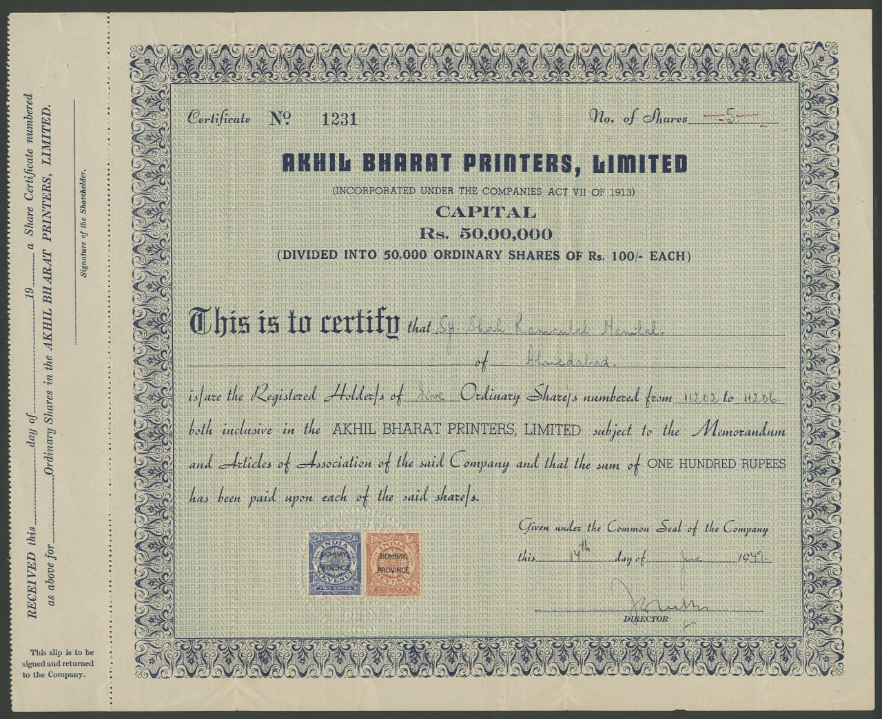 Incorporato ai sensi dell'Indian Companies Act del 1913. Capitale 50.000.000 di rupie in azioni ordinarie di 100 rupie.