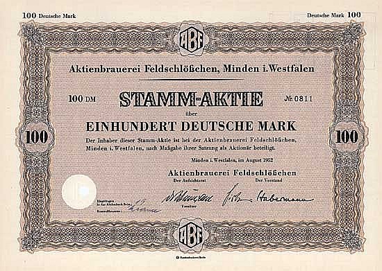 A-65733Aktienbrauerei Feldschlösschen Minden i. Westfalen-1Minden i. Westfalen19521 azione da 100 Marchi--
