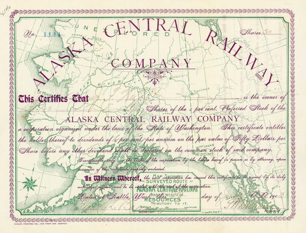 Fondata nel 1902 su iniziativa di John Ballaine, un giovane imprenditore immobiliare di Seattle, Washington. Sono state emesse 550.000 azioni ordinarie e 50.000 azioni privilegiate con il 5% di interesse per un valore nominale di $ 50 ciascuna. $ 30 milioni sono confluiti nel progetto per costruire una ferrovia lunga 450 miglia dalla città portuale di Seward sul Golfo dell'Alaska attraverso la valle di Susitna, poi attraverso il Broad Pass attraverso le montagne giganti della catena dell'Alaska tra il monte Hayes alto 4.175 m e il 6.200 m di altezza Mt. McKinley (la montagna più alta dell'Alaska), infine di nuovo giù per Fairbanks sul fiume Tanana fino a Rampart sul fiume Yukon. La costruzione della ferrovia iniziò il 16 aprile 1904 e la prima locomotiva Bal... Altro