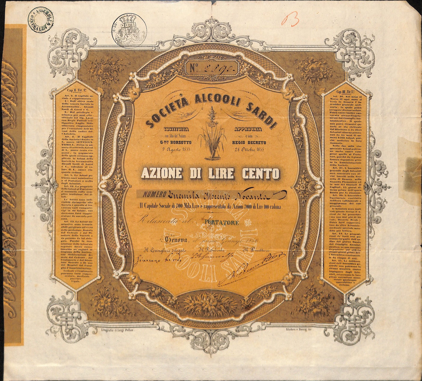 A-11340Alcooli Sardi Soc.-1Lit. e Tip. Luigi PellasGenova18561 azioneR3 (501-1000 pezzi)S5 (da 251 a 500 €)