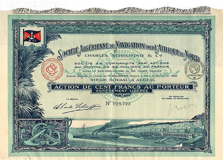 Storica società di navigazione, la più grande dell’Algeria, a lungo specializzata nel trasporto di vino tra il Nord Africa ed il porto francese di Rouen. Fu fondata nel 1874 dai fratelli Schiaffino – di origine genovese – come Société Schiaffino Frères. In seguito a varie fusioni assunse nel tempo diverse denominazioni, tra cui: Franceschi, Schiaffino & Cie – Franceschi, Schiaffino, Achaque & Cie – Société Algerienne de Navigation Cotiere Schiaffino & Nyer-Sitges – C. Schiaffino, A. Jouvet & Cie e Laurent Schiaffino & Cie. Nel 1919 l’armatore Charles Schiaffino si separò dal figlio Laurent, divenuto Senatore di Algeri, ed ognuno di essi creò la propria compagnia di navigazione. Durante la seconda guerra mondiale ben 19 navi delle 20 di proprietà della Charles Schiaffino furono affondate. Tuttavia la compagnia riuscì a far fronte alle gravi difficoltà del momento e a risollevarsi; si sciolse solo nel 1990.