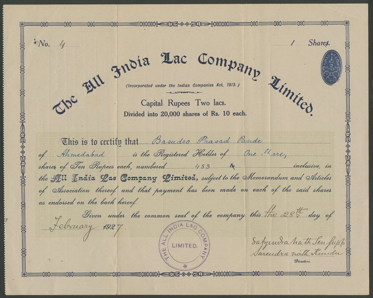 Incorporato ai sensi degli Indian Companies Acts del 1913. Capitale 2.000.000 di rupie in azioni ordinarie di 10 rupie.