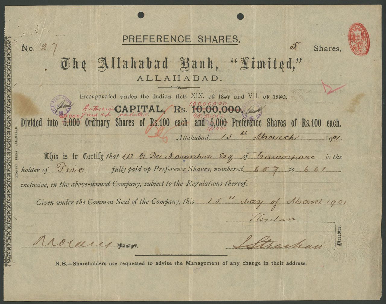 Registrato prima del 1901. Capitale privilegiato 10.000.000 di rupie in 5000 azioni ordinarie e 5000 azioni privilegiate. Questo è stato aumentato dal 1917 a 30,00,00 rupie in 15.000 azioni ordinarie e 15.000 azioni privilegiate, e di nuovo dal 1946 a 1,00,00,00 rupie in 85.000 azioni ordinarie e 15.000 azioni privilegiate, di cui sono state pagate solo 50 rupie per azione .