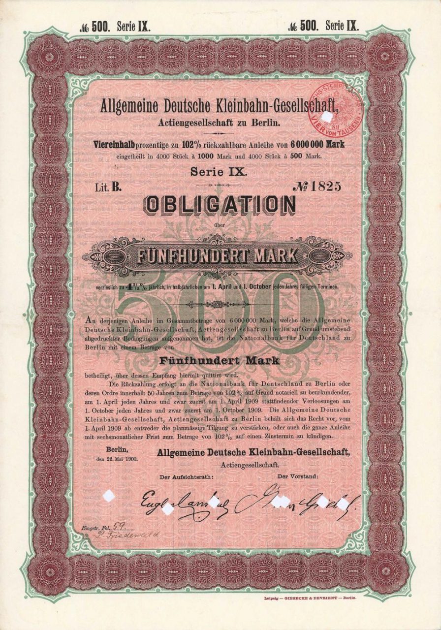 B-65757Allgemeine Deutsche Kleinbahn-Gesellschaft AG-2Berlino19001 obbligazione 4,5% da 500 MarchiR3 (501-1000 pezzi)S4 (da 101 a 250 €)