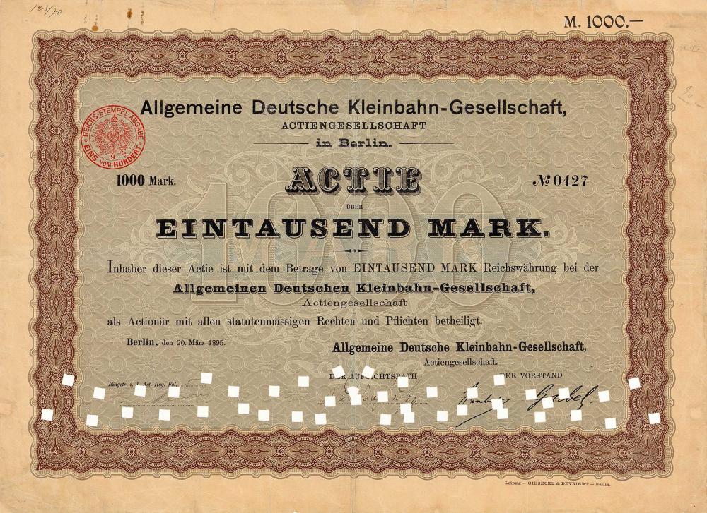 A-65757Allgemeine Deutsche Kleinbahn-Gesellschaft AG-1Berlino18951 azione da 1.000 MarchiR6 (51-100 pezzi)S7 (da 1.001 a 1.500 €)