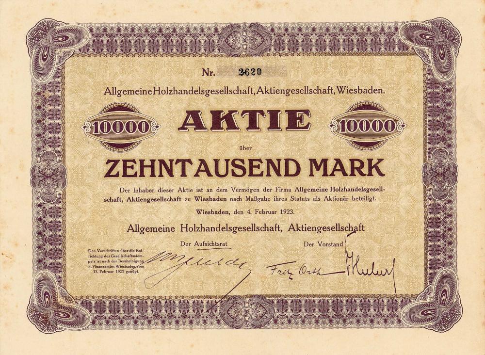 Fondata il 4 febbraio 1923 dopo aver rilevato i padiglioni del Mainzer Landstr. 118 a Wiesbaden di proprietà di Allgemeine Holzhandelsgesellschaft mbH. Commercio di legname e attività di segheria.