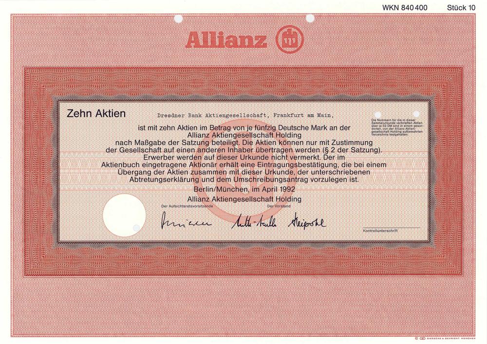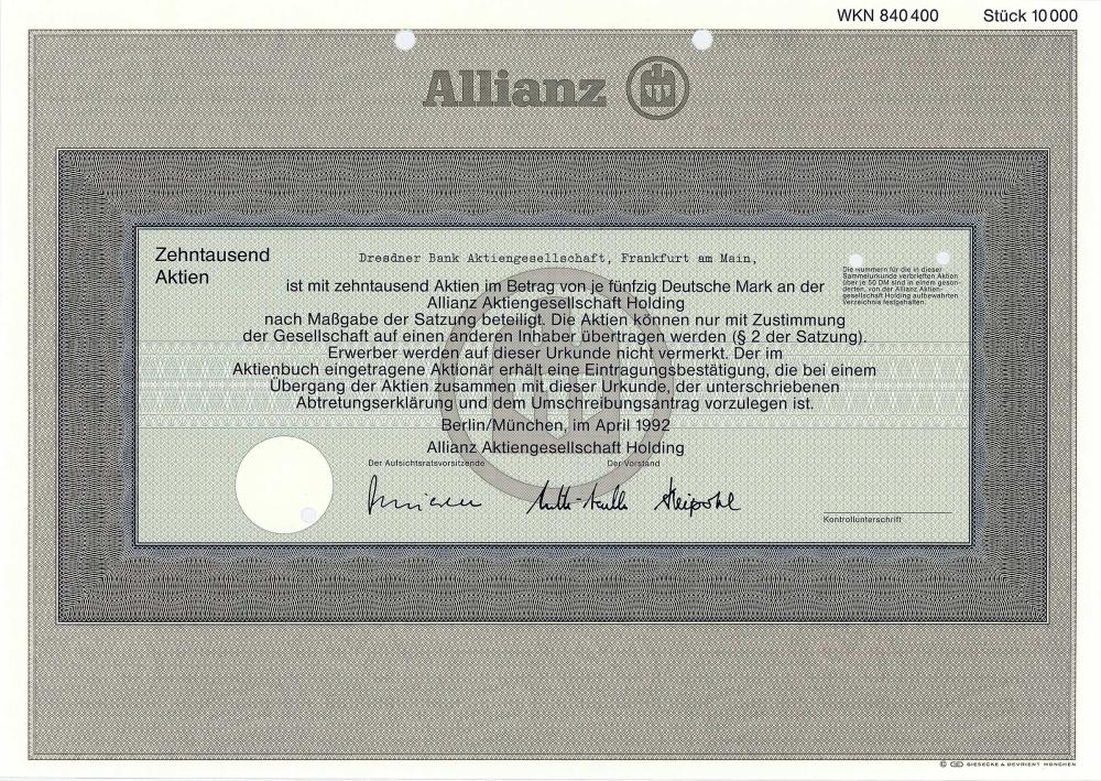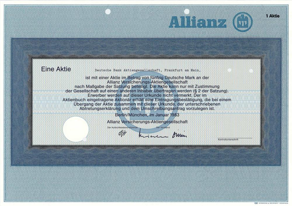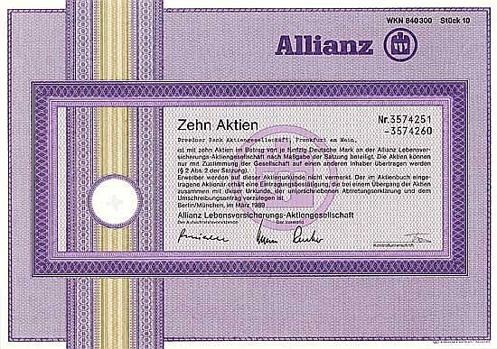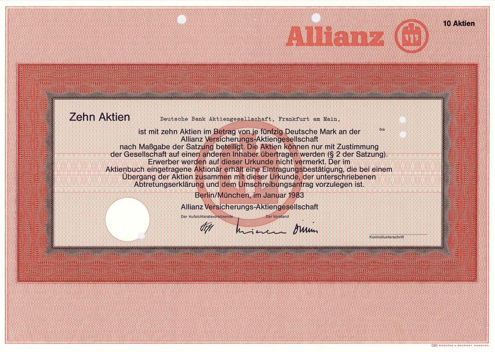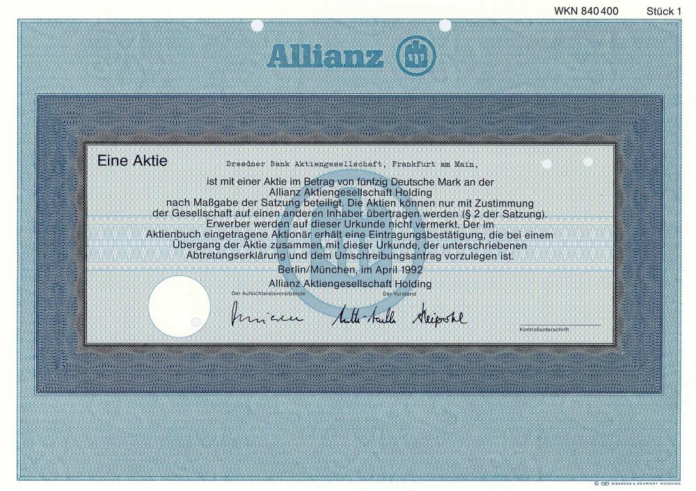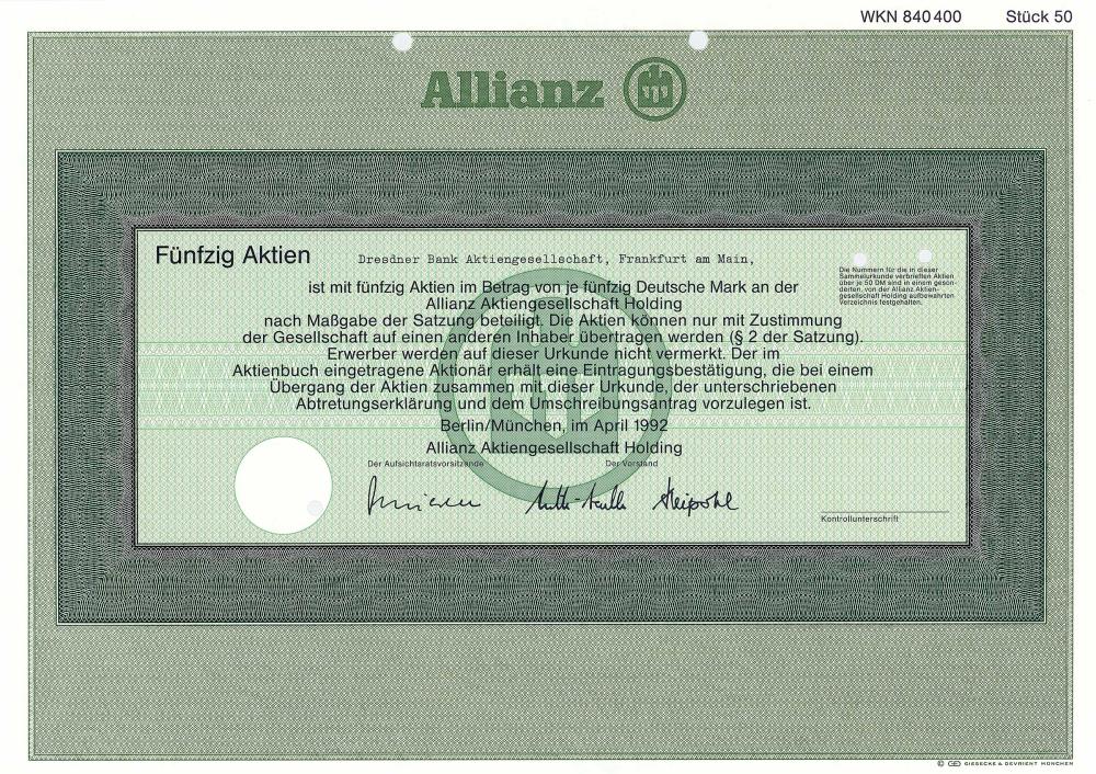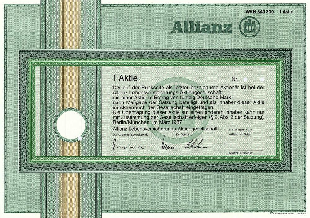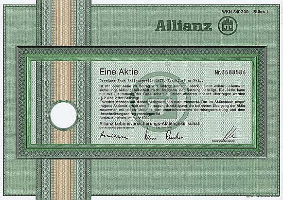 Con l’anno di fondazione 1890, Allianz fu all’inizio traballante tra le compagnie assicurative tedesche. Ma rilevando le società concorrenti, ha rapidamente trovato un collegamento con i vertici: la compagnia assicurativa Fides a Berlino (1905), Süddeutsche Feuerversicherungs-Bank (1906), Bayerische Lloyd (1909) e Kölnische Versicherungs-Bank (1920) si unirono al gruppo. Il 1921 fu un anno particolarmente espansivo. Sono state rilevate 5 compagnie assicurative a Berlino, Karlsruhe e Amburgo, nonché la costituzione della compagnia assicurativa “Kraft” del club automobilistico tedesco e l’acquisizione del portafoglio assicurativo tedesco in Svizzera. Compagnia assicurativa nazionale a Basilea. Nel 1922 fondazione della banca di assicurazioni sulla vita Allianz. Nel 1923 Allianz fece molta strada acquisendo le quote di “Bayer. Versicherungs-Bank AG” (ex compagnie assicurative della Bayerische Hypotheken- und Wechsel-Bank). Nel 1927 fusione con la Stuttgarter Verein Versicherungs-AG, poi dal 1927 al 1940 denominazione dell’azienda come “Allianz und Stuttgarter Verein Versicherungs-AG”. Nel 2006 acquisizione della RAS italiana e conversione simultanea in AG europea (SE = lat. Societas Europaea). C’era una ragione pratica per il fatto che la sede della fondazione “urbana” era formalmente Berlino sin dall’inizio, per una ragione pratica: ad Allianz era anche permesso fare affari nella più importante area d’affari della Prussia.