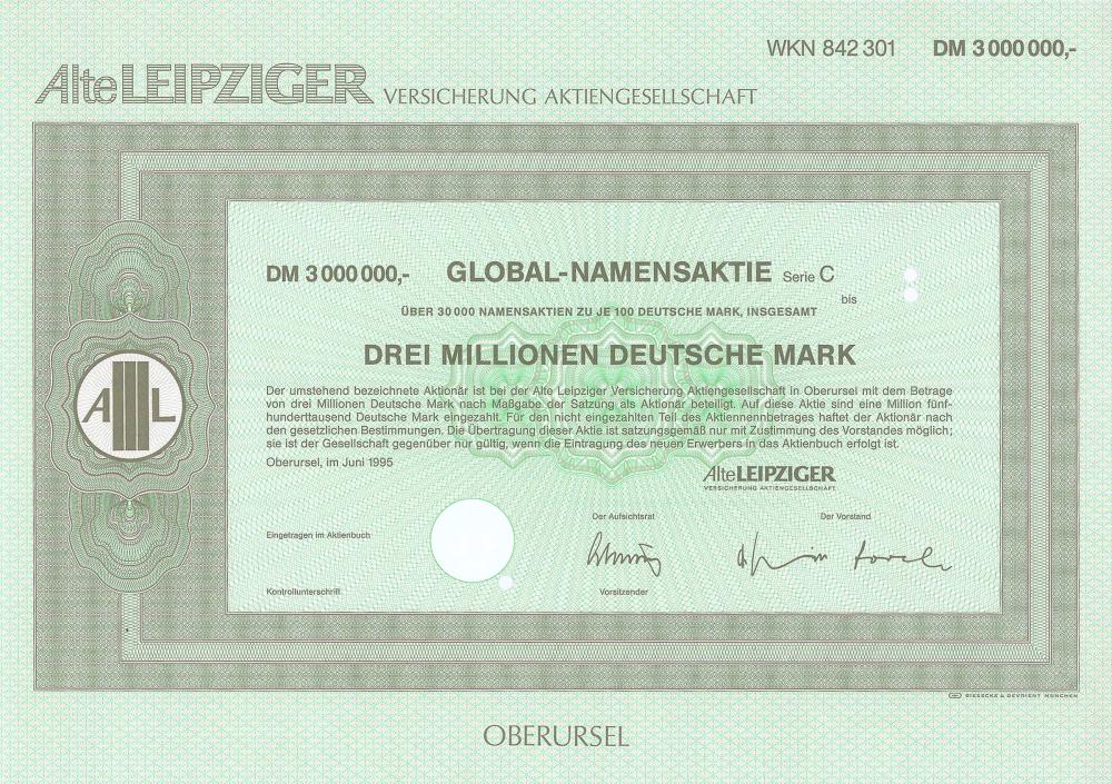 Compagnia di assicurazioni molto antica fondata nel 1819 con un capitale di 1 milione di Talleri. Dal 1838 attiva nella monarchia del Danubio. Nel 1929 acquisizione della compagnia di assicurazioni sulla vita “Lebenswacht” a Lipsia e nel 1939 del “Heimat”, compagnia di assicurazioni a Vienna. Nel 1945 chiusura della direzione per ordine dell’amministrazione militare sovietica, sede trasferita a Bonn nel 1948 e a Francoforte sul Meno nel 1956. Nel 1970 acquisizione del portafoglio di Leipziger Allgemeine e contemporaneamente ridenominazione in “Alte Leipziger Versicherung AG”. Nel 1974 ultimo trasferimento a Oberursel.