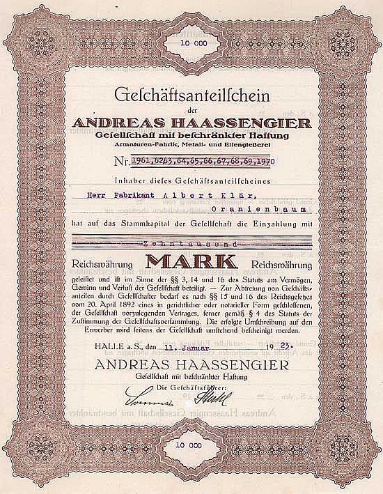 Fabbrica di raccordi e fonderia di metalli fondata nel 1841. La società di Hordorfer Strasse 41 fu espropriata nel 1949.