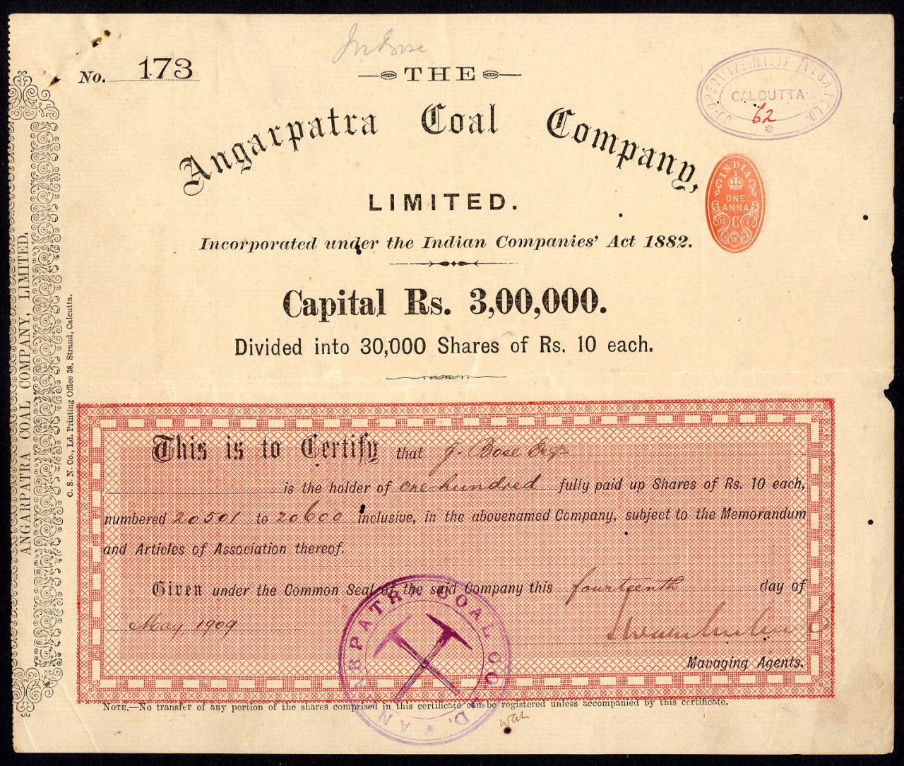 Incorporato ai sensi dell’Indian Companies Act 1882. Capitale 3.000.000 di rupie in azioni di 10 rupie.