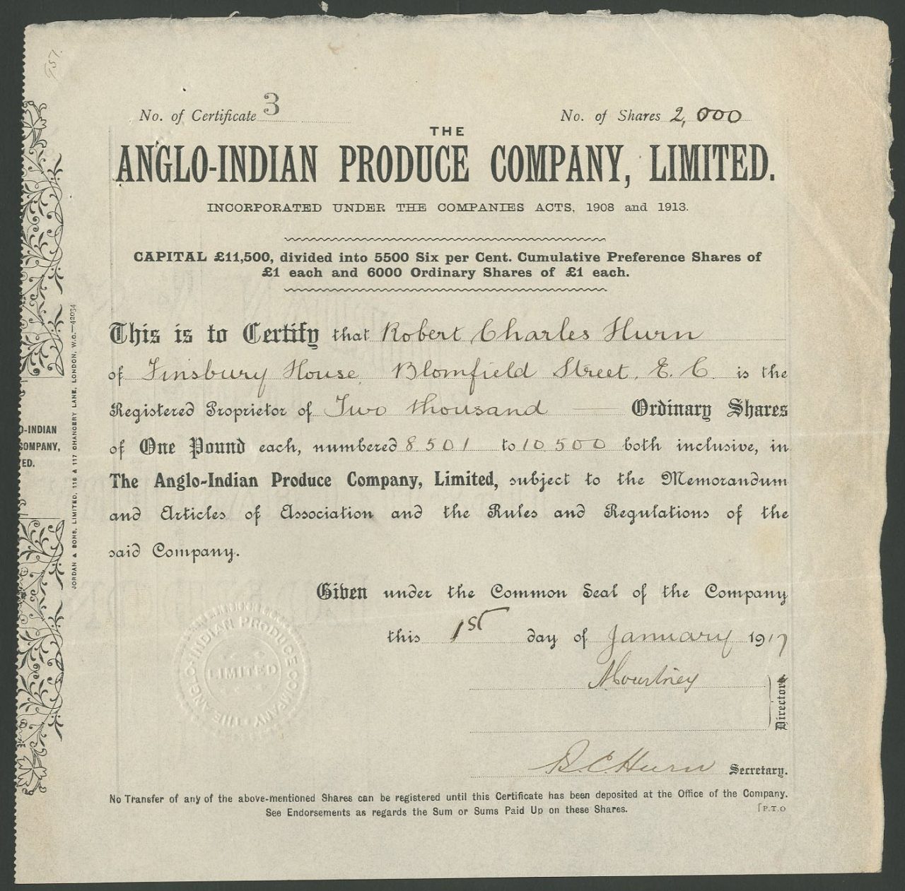 Capitale £ 11.500 in 6.000 azioni ordinarie di £ 1 e 5.500 azioni privilegiate al 6% di £ 1.