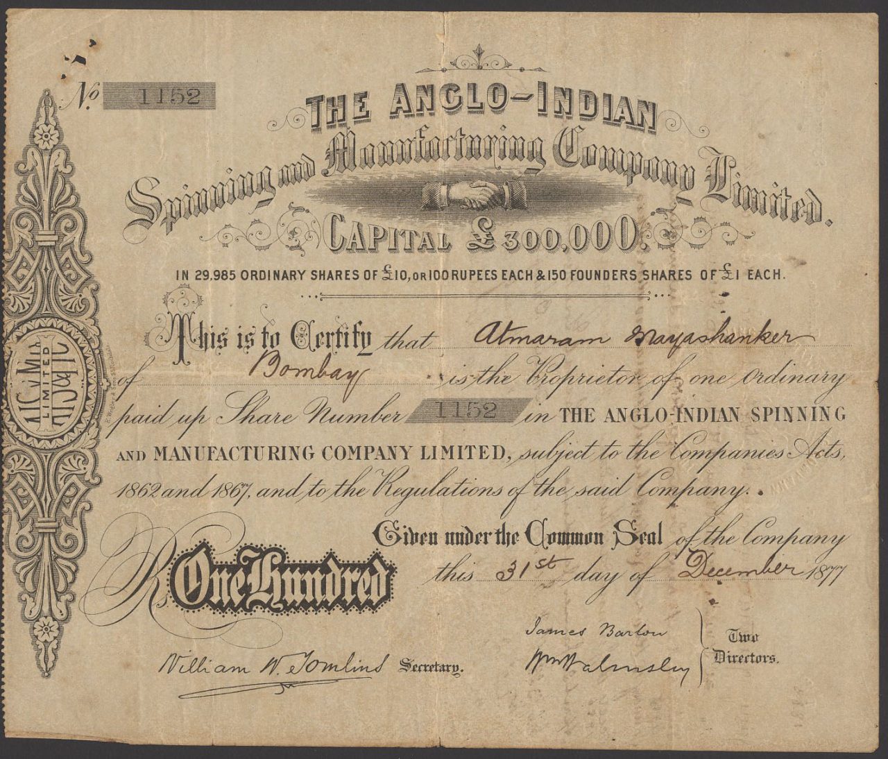 A-36916Anglo Indian Spinning and Manufacturing Company Ltd-1India1877£10 Shares - BlackR2 (1001-5000 pezzi)S2 (da 26 a 50 €)