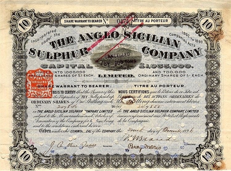 Per consentire la ripresa dei loro affari essi costituirono l'”Anglo Sicilian Sulphur Company“, che avrebbe acquistato la massima quantità possibile di zolfo siciliano e l’intera produzione dello zolfo rigenerato col processo Chance, in modo da controllare il mercato zolfifero. La società si impegnava ad acquistare l’intera produzione al prezzo di 80 lire circa per tonnellata; la produzione era libera il primo anno, mentre in seguito non doveva superare la quantità in esso raggiunta.