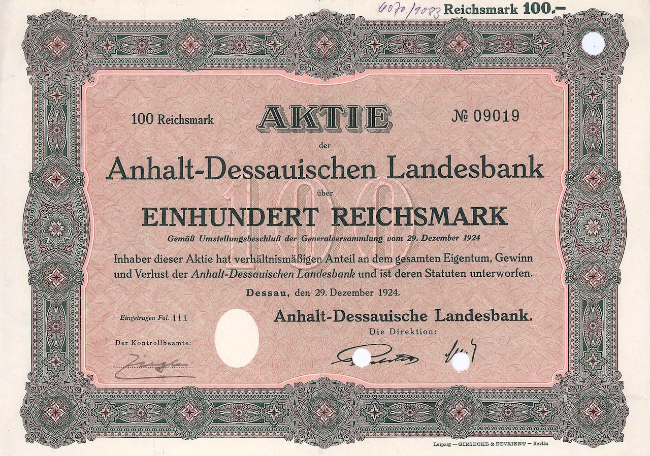 Antica banca regionale fondata nel 1846. La concessione del 2 gennaio 1847 conferì alla banca il privilegio delle banconote. Inizialmente attiva anche come banca ipotecaria. La banca aveva 18 filiali e fondi di deposito, tra gli altri. a Ballenstedt, Bernburg, Cöthen, Calbe, Finsterwalde, Torgau, Wittenberg e Zerbst. Dopo la fondazione della Reichsbank nel 1871, la banca ha rinunciato al privilegio delle banconote e in seguito ha rinunciato all’attività dei mutui (l’ipoteca in circolazione Pfandbriefe è stata annullata). Nel settore bancario della Paul Schauseil & Co. di Halle a.S., Dingel & Co. di Magdeburg e dello Zörbiger Bankverein esistevano società in accomandita semplice. Elencata a Berlino e Lipsia. Dall’agosto 1921 un gruppo di interesse con l’Allgemeine Deutsche Credit-Anstalt a Lipsia, che allo stesso tempo assunse una ben notevole partecipazione. Nel maggio del 1932 l’ADCA subentrò nella crisi bancaria e le azioni furono scambiate 4:1.