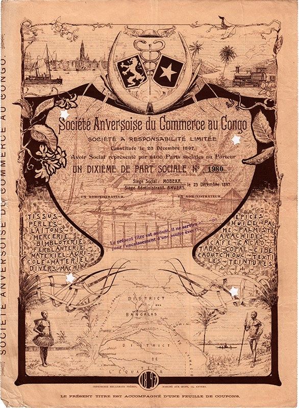 La compagnia, costituita originariamente nel 1892 con sede amministrativa ad Anversa in Belgio e sociale a Mobeka in Congo, ottenne la concessione dall’allora Stato Libero del Congo di esportare numerosi prodotti, in particolare il caucciù e l’avorio provenienti dal bacino del fiume Mongala – affluente del Congo – nella regione di Bumba, distretto del Bangala. Visse violenti conflitti anche a causa della condizione di schiavitù in cui versavavo i lavoratori locali. Nel 1911 si fuse con l’Anglo-Belgian India Rubber Company – Sabir, dando origine alla Compagnie du Congo Belge (lotto precedente). Splendida veste grafica con sinuosi motivi ornamentali e tratti Liberty. In alto emblemi del Regno belga e del Congo. Vignette del porto di Anversa e di un villaggio con indigeni, piantina del distretto congolese in cui operava la società. Ai lati sono descritti i numerosi prodotti destinati all’esportazione fra cui, oltre a caucciù ed avorio, sono menzionati spezie, coloranti, olio di palma, arachidi, caffè, cacao, tabacchi, tessuti, perle e generi agricoli.