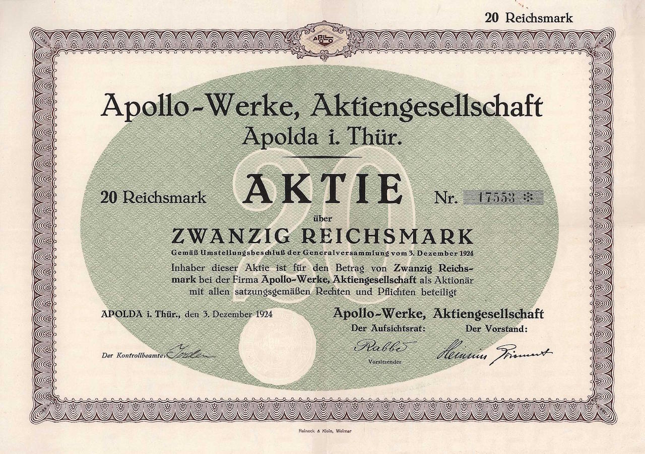 Fondata nel 1908 come A. Ruppe & Sohn AG, dal 1912 come sopra. Fabbricazione di automobili dei marchi “Piccolo” e “Apollo” e di motori. A causa dei bassi prezzi di vendita, della buona qualità e dei molti successi nelle corse automobilistiche, i modelli erano molto popolari. Hugo Ruppe (1897-1949) fu responsabile dello sviluppo di questi veicoli ma nel 1910 lasciò la compagnia. Il successore fu il pilota di corse Carl Slevogt (1876-1951), che ha introdotto il nuovo marchio “Apollo”. Negli anni seguenti, le opere di Apollo si trasformarono nella più grande azienda di lavorazione dei metalli di Apolda. Tuttavia, per evitare ulteriori perdite, la produzione di trattori è stata abbandonata negli anni ’20. La liquidazione seguì negli anni ’30.