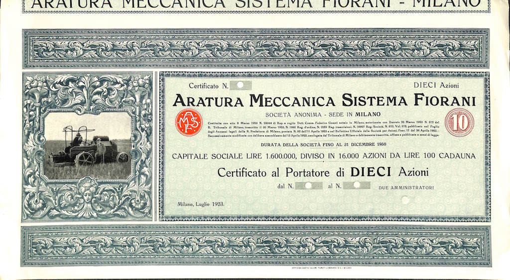 A-6516Aratura Meccanica Sistema Fiorani S.A.-1Officina Carte Valori Turati Lombardi e C. - MilanoMilano192310 azioniR3 (501-1000 pezzi)S3 (da 51 a 100 €)