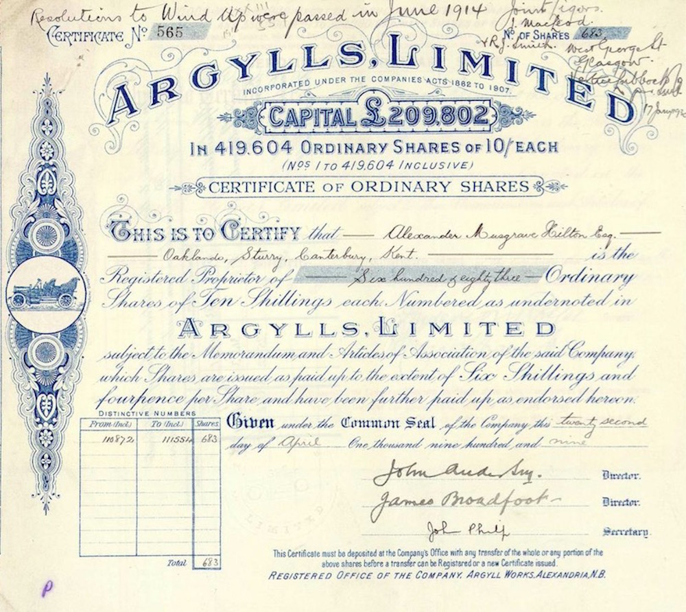 La società Hozier Engineering Co. Ltd. iniziò a produrre automobili a Bridgeton vicino a Glasgow nel 1899. Nel 1905 la società fu ribattezzata Argyll Motors Ltd. La produzione cessò nel 1928.