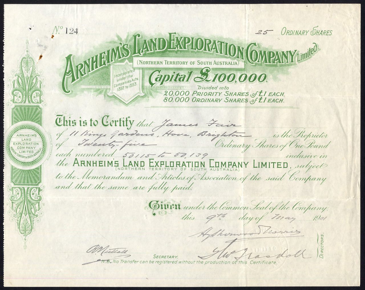 A-31808Arnheim’s Land Exploration Company Ltd-1Territorio del Nord1901ordinary sharesR2 (1001-5000 pezzi)S2 (da 26 a 50 €)