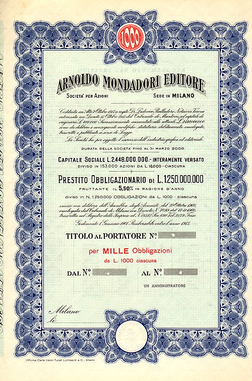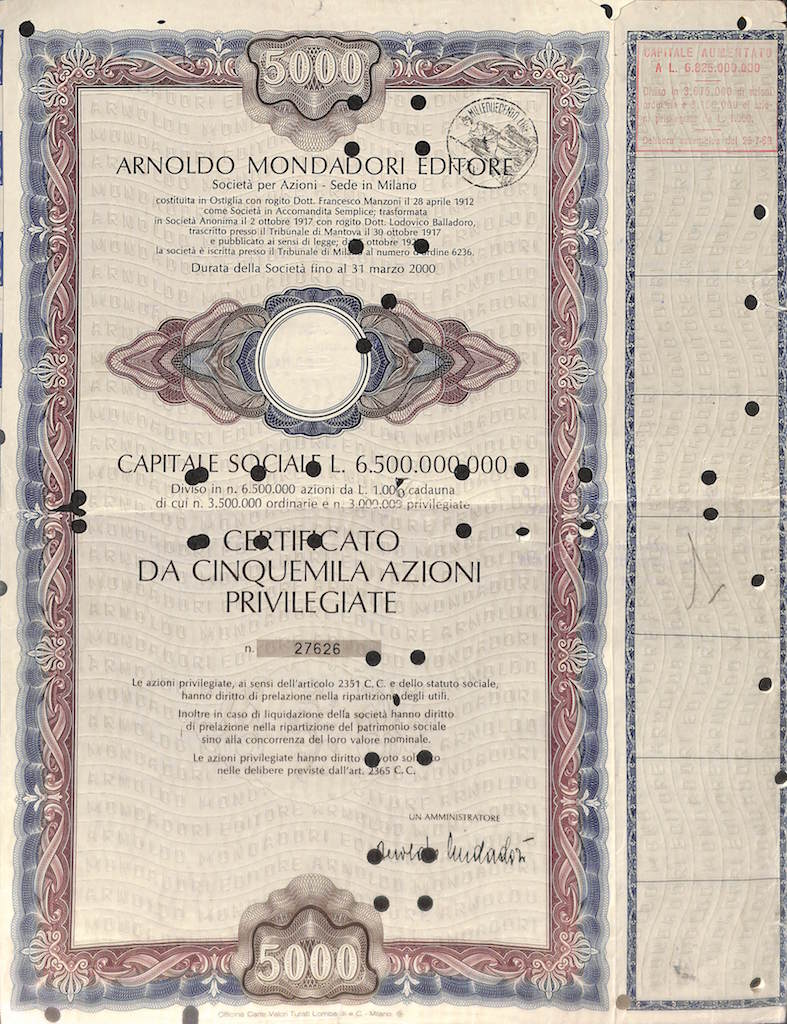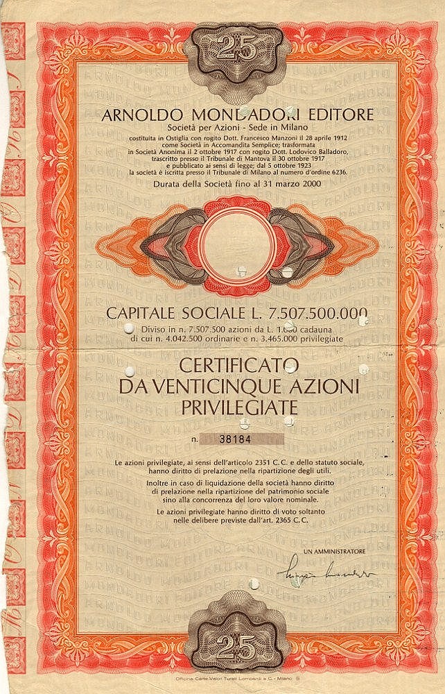 La Società Arnoldo Mondadori Editore Spa è stata costituita nel 1912 ed è stata ammessa alle quotazioni di borsa nel 1965. L’anno di cessazione e cancellazione dal listino è stato il 1991. Capitale sociale iniziale L. 70.000.