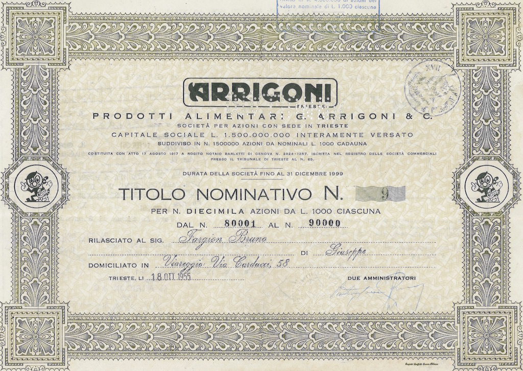 Marchio dell’azienda ai due lati, fregi nel bordo. La G. Arrigoni, sorta quasi per caso nel 1855 a Trieste, diventò nel tempo la più grande industria italiana di conserve alimentari specializzata nella lavorazione e conservazione di pesce, vegetali e frutta. Fra i suoi presidenti compare Giorgio Sanguinetti (1881-1943), che assicurò all’azienda una fortissima espansione grazie ad un’intensa opera di modernizzazione. Oltre agli stabilimenti in Venezia Giulia, alla fine degli anni Venti ne furono acquistati due: uno a Cesena – il Consorzio Industrie Agrarie – e uno a Sesto Fiorentino. Come tutte le aziende storiche ha vissuto fasi alterne: oggi è una SpA che coniuga l’esperienza acquisita nel tempo con le tecnologie più avanzate.