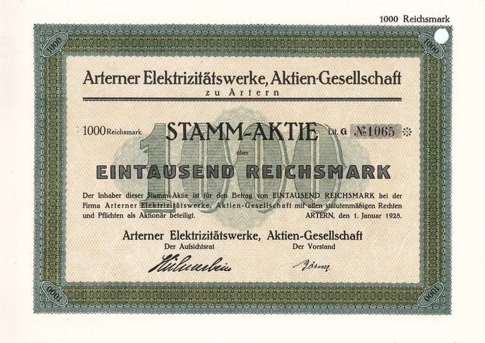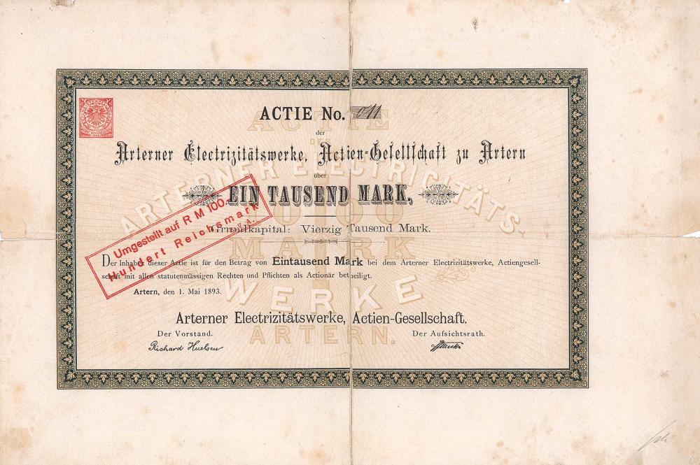 Fino alla navigabilità nel 18 ° secolo, l’Unstrut scorreva liberamente attraverso la città di Artern. Successivamente è stato rinchiuso da argini nel 1791-93 (ricostruito nel 2007). L’energia idroelettrica di Unstrut non solo guidava le ruote del grande mulino ad acqua, ma in seguito anche la turbina idraulica della compagnia elettrica fondata nel 1893. L’impianto è stato successivamente ampliato per includere tre macchine a pistoni a vapore. Dopo la conclusione del nuovo contratto di concessione nel 1908, il comune di Artern fu in grado di acquisire la centrale elettrica e la rete di fornitura in qualsiasi momento a un’aliquota fiscale, il che non era così urgente, poiché la città era anche il principale azionista della centrale elettrica. Nel 1941 viene ribattezzata Städtische Elektrizitätswerke Artern AG. Espropriata dopo il 1945.
