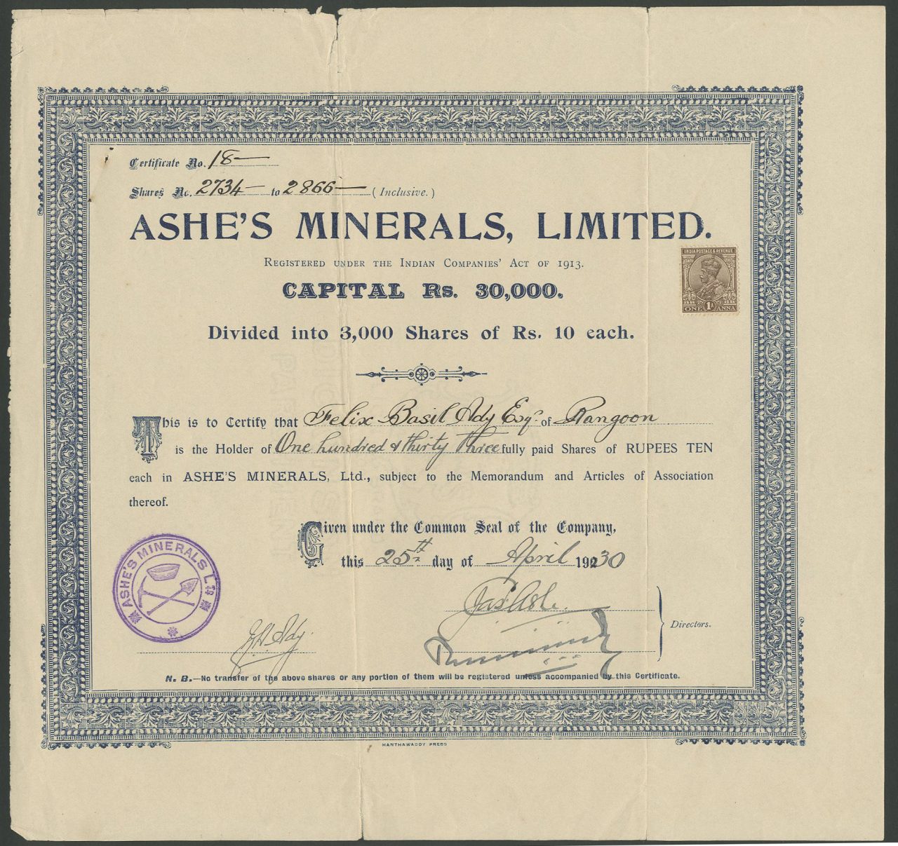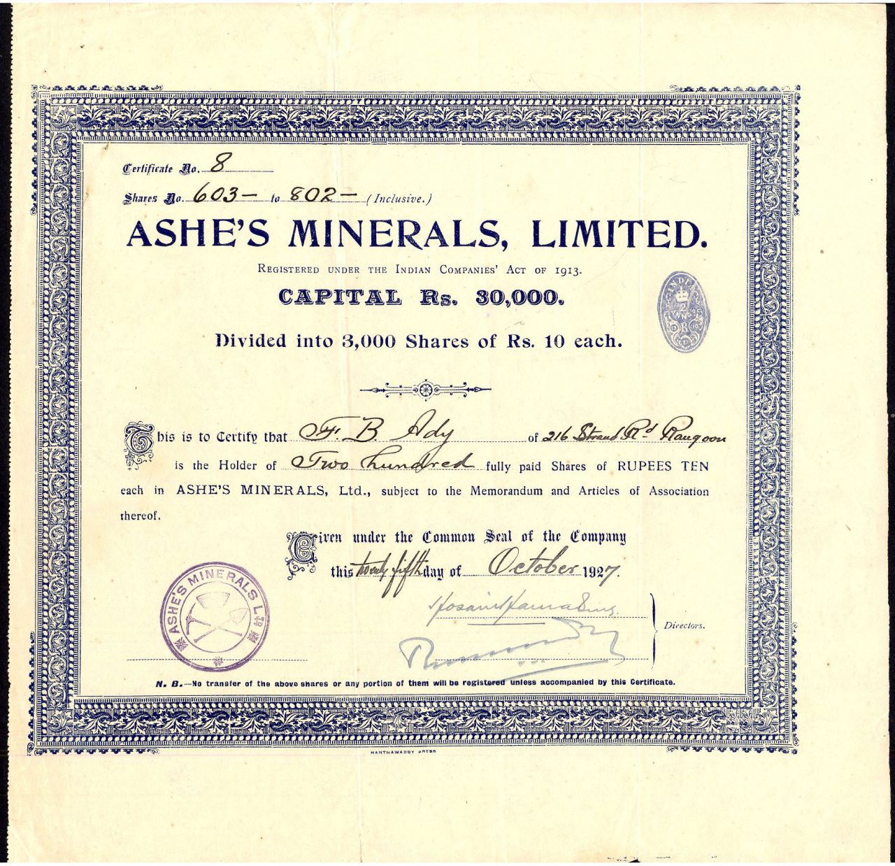 A-37024Ashe’s Mineral Limited-1India192710 rupee shareR1 (Più di 5000 pezzi)S1 (da 0 a 25 €)