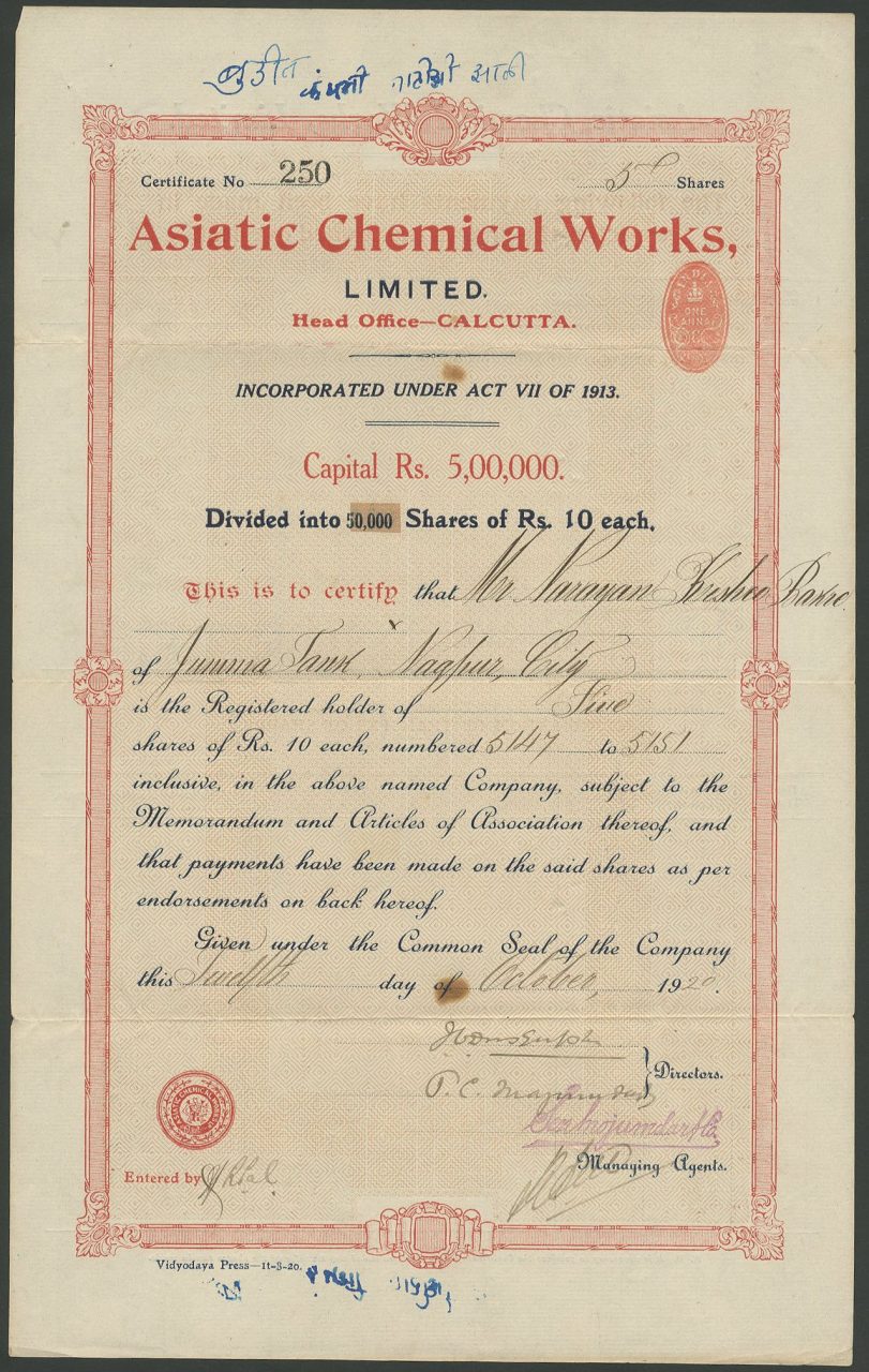 Incorporato sotto gli Indian Companies Acts del 1913. Sede a Calcutta. Capitale 5.000.000 di rupie in azioni di 10 rupie.