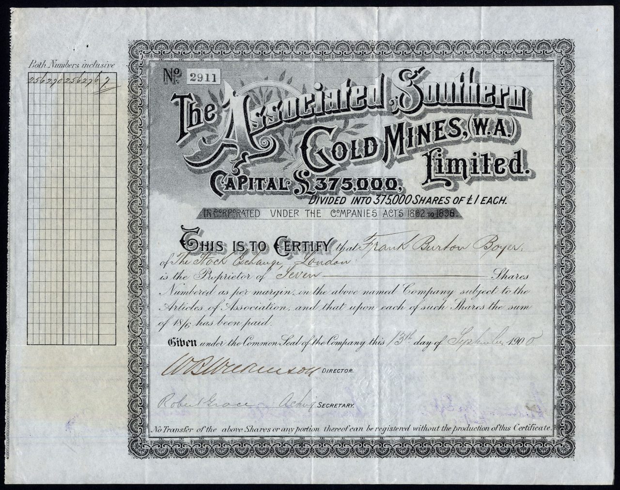 Registrato nel 1899 per acquisire 15 contratti di locazione nel distretto dell’Australia occidentale di Hannan. Dissolto <1916. Numero società 64149