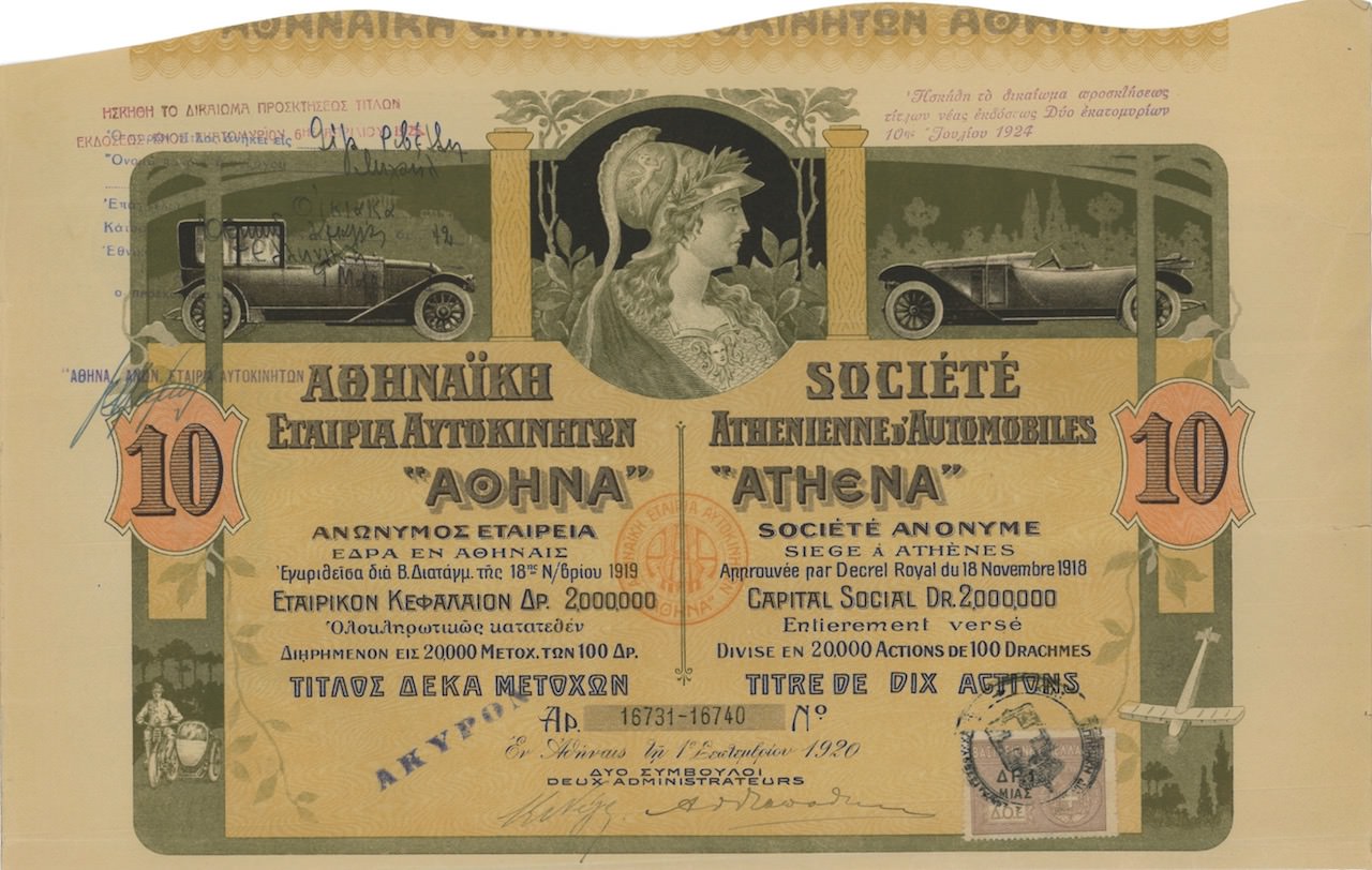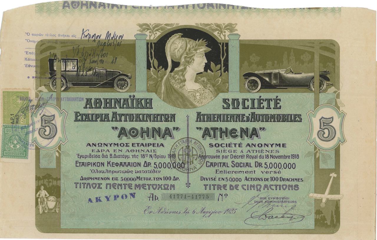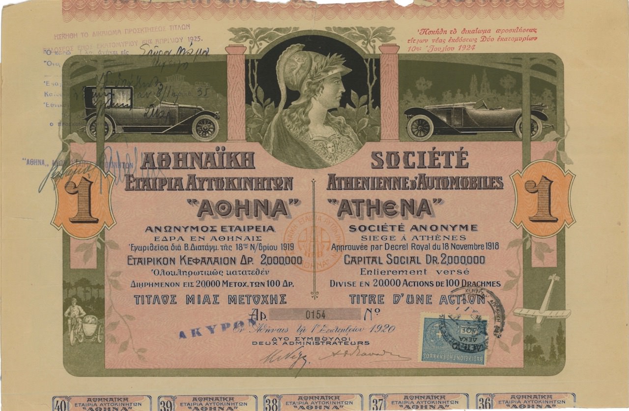 A-27438Athena – Soc. Atenienne d’Automobiles-1N.D.Atene19201 azioneR3 (501-1000 pezzi)S3 (da 51 a 100 €)